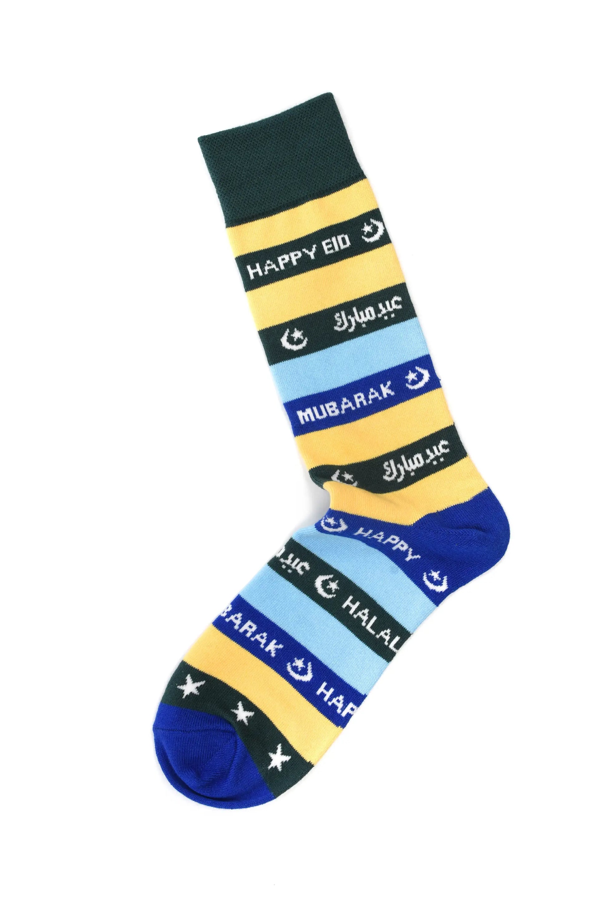 Celebrate Eid with a bold splash of colour in our Tropical Happy Eid socks. Designed with fun, vibrant hues inspired by warm days and joyful celebrations, this version brings a playful energy to your Eid look. With Happy Eid and Eid Mubarak written in both English and Arabic, these socks are made to stand out and spread smiles.