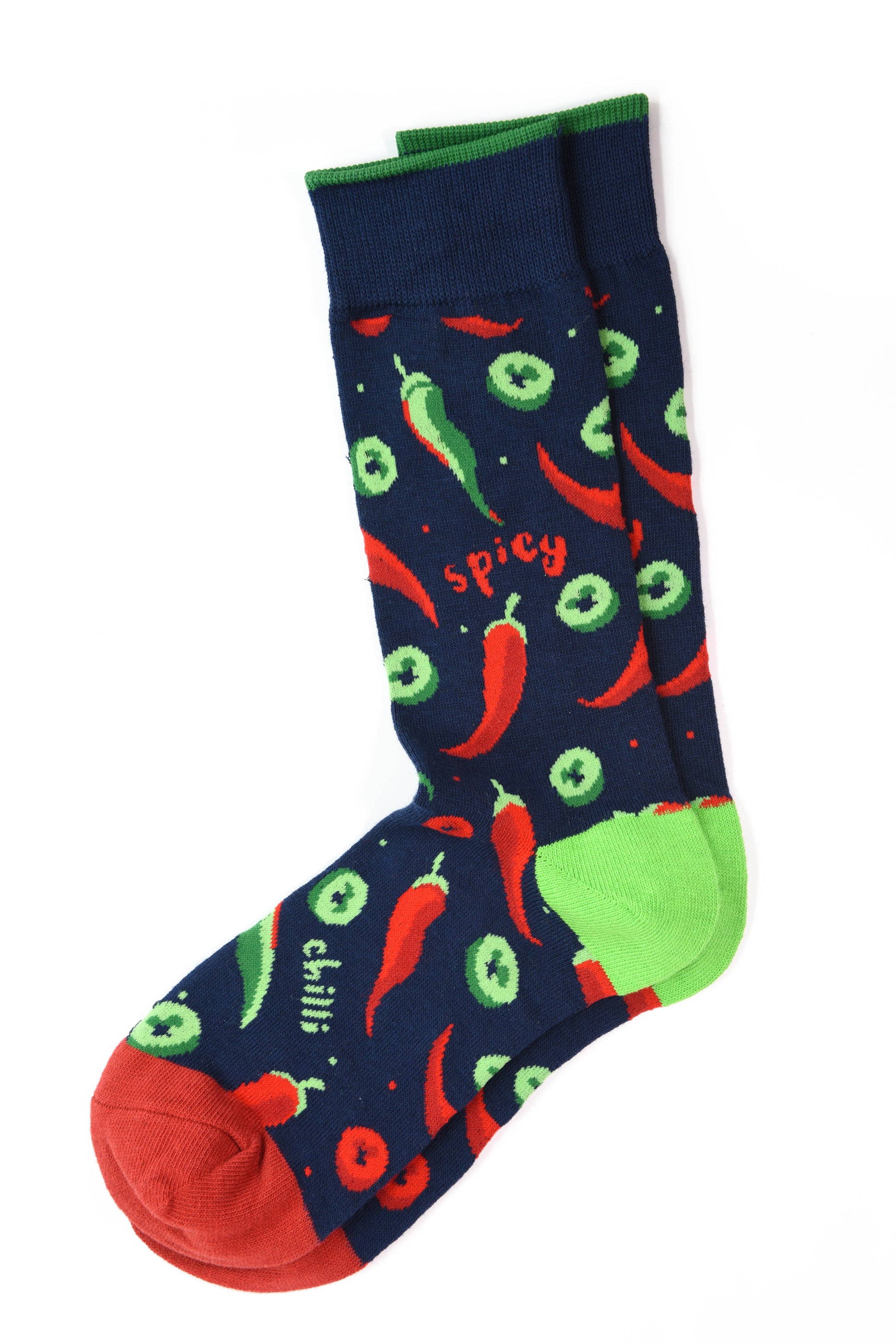 Add some spice to your wardrobe with Mirchi socks! Featuring a bold design with peppers and the word "spicy," these socks will add a touch of heat to your outfit. The dark blue background and vibrant red and green accents make these socks a must-have for any spicy enthusiast.