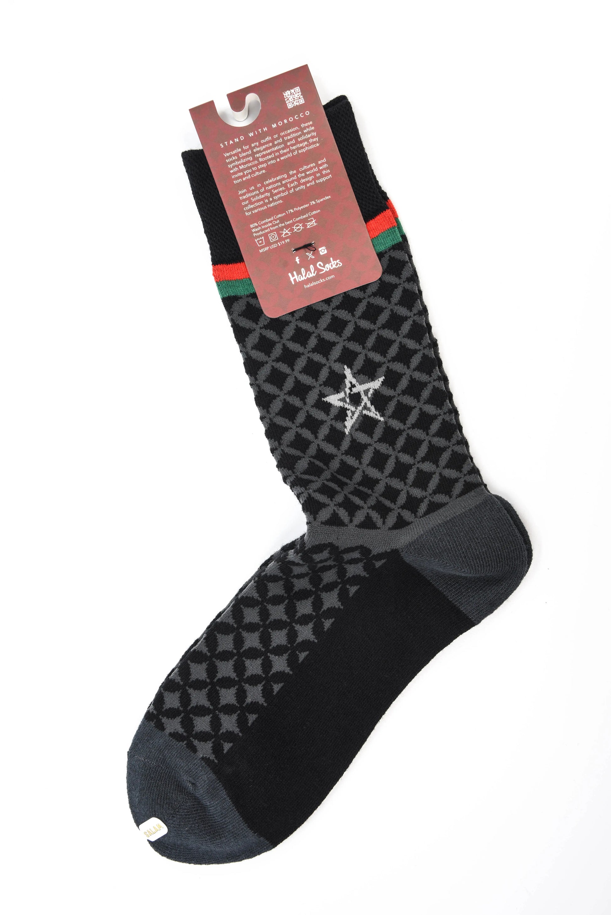Unleash your adventurous spirit with Morocco socks! Inspired by the beautiful country of Morocco, these socks feature the iconic Moroccan star and colors from their flag. The 2-tone design ensures they will match with all your outfits, making them a versatile and stylish addition to your wardrobe. Show your solidarity and add a touch of culture to your look with Morocco socks.