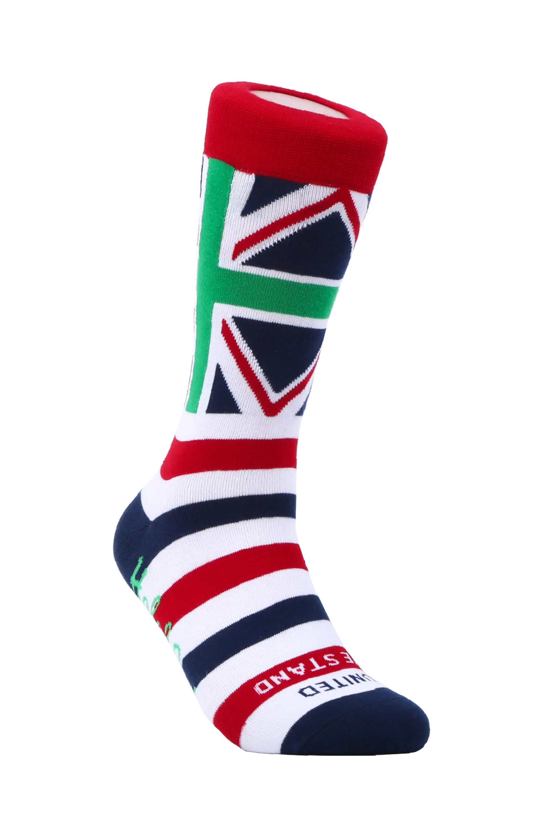 As a part of the Solidarity collection, these socks honor the Muslim communities in Britain. Embrace the values of peace, inclusivity, and diversity by wearing our vibrant Muslim (green) Union Jack solidarity socks. With "United We Stand" woven onto each toe, these unique socks make a statement about your stance. Wear them proudly to express your support.